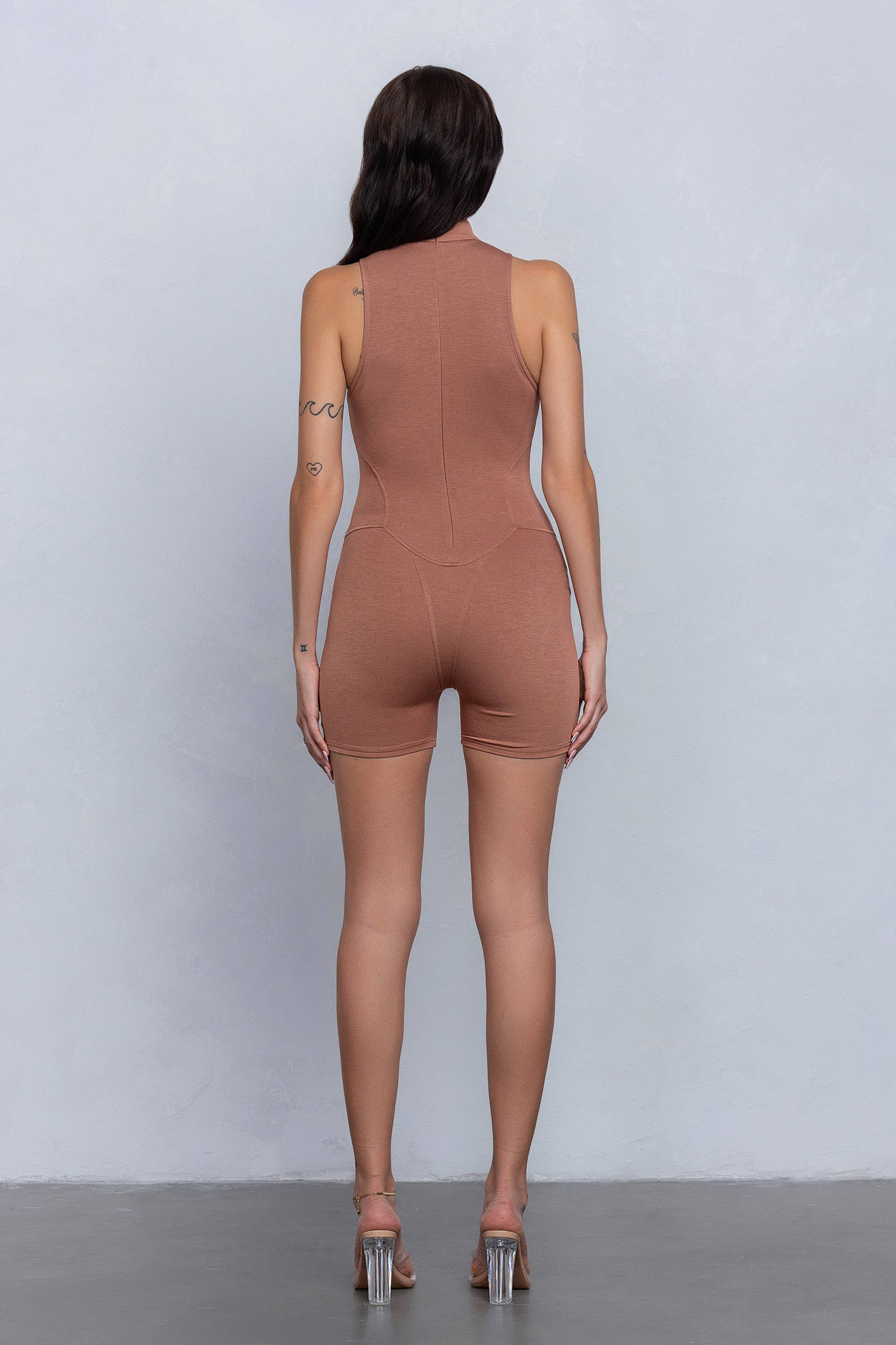 - Soft & lightweight mockneck romper w/zipper detail